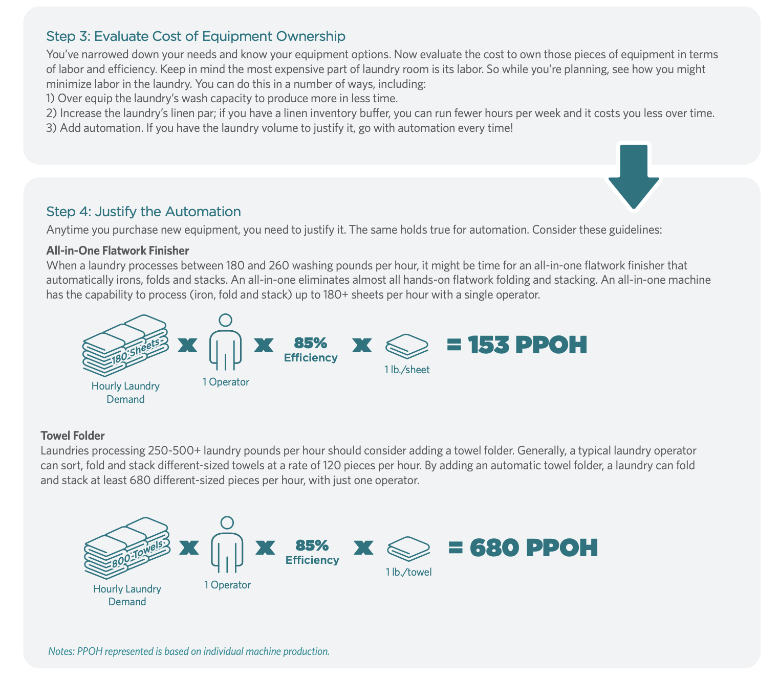 All industrial, commercial and on-premise laundries process different items, utilize different pieces of equipment, strive toward unique quality goals and operate at varying levels of efficiency. When it comes to purchasing new equipment or replacing old equipment, proper sizing is critical. Before you do anything, reach out to your equipment distributor and begin a dialogue. The best way to properly size a laundry, and its equipment, is through back-and-forth conversations on the type and number of items being laundered, the laundry’s hours of operation, labor required, space available and ownership costs. By considering all the variables, you’ll select the best equipment to suit your needs, now and into the future.